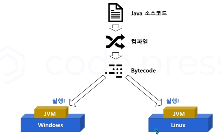 Java로 컴파일된 결과물을 Bytecode라 하는데, JVM이 설치된 곳이라면 어디든 돌릴 수 있다.