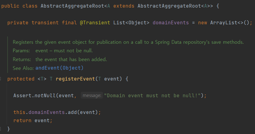 - AbstractAggregateRoot 클래스는 내부적으로 도메인 이벤트를 쌓아 놓다가 리포지토리에서 save를 하면 전부 보내도록 추상화 해놓았다.