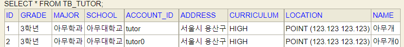 POINT(x좌표, y좌표) 형태로 잘 저장된 것을 확인할 수 있다.