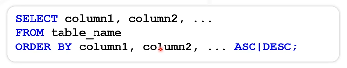 - WHERE 절을 먼저 적어서 조건을 설정하고, ORDER BY를 그 뒤에 적어 정렬 조건을 적어줌
