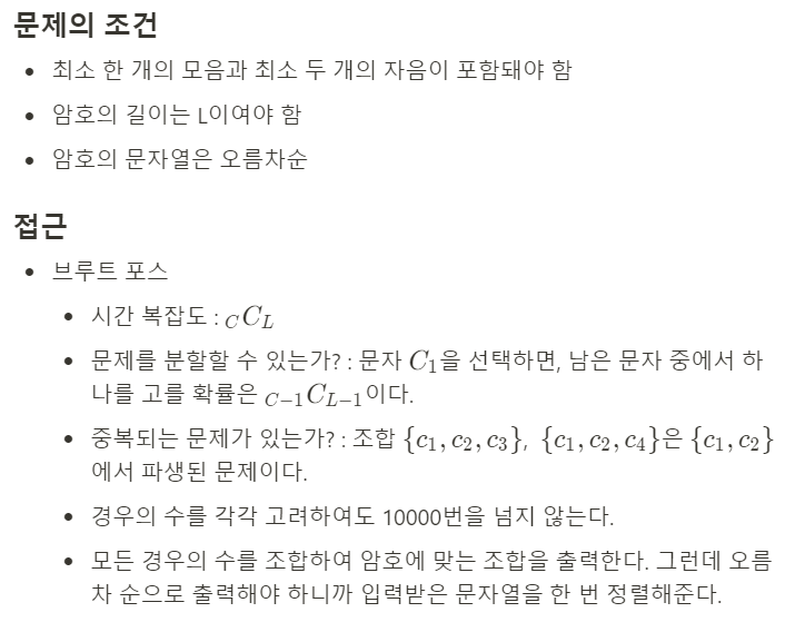 첫째 줄에 두 정수 L, C가 주어진다. (3 ≤ L ≤ C ≤ 15) 다음 줄에는 C개의 문자들이 공백으로 구분되어 주어진다. 주어지는 문자들은 알파벳 소문자이며, 중복되는 것은 없다.